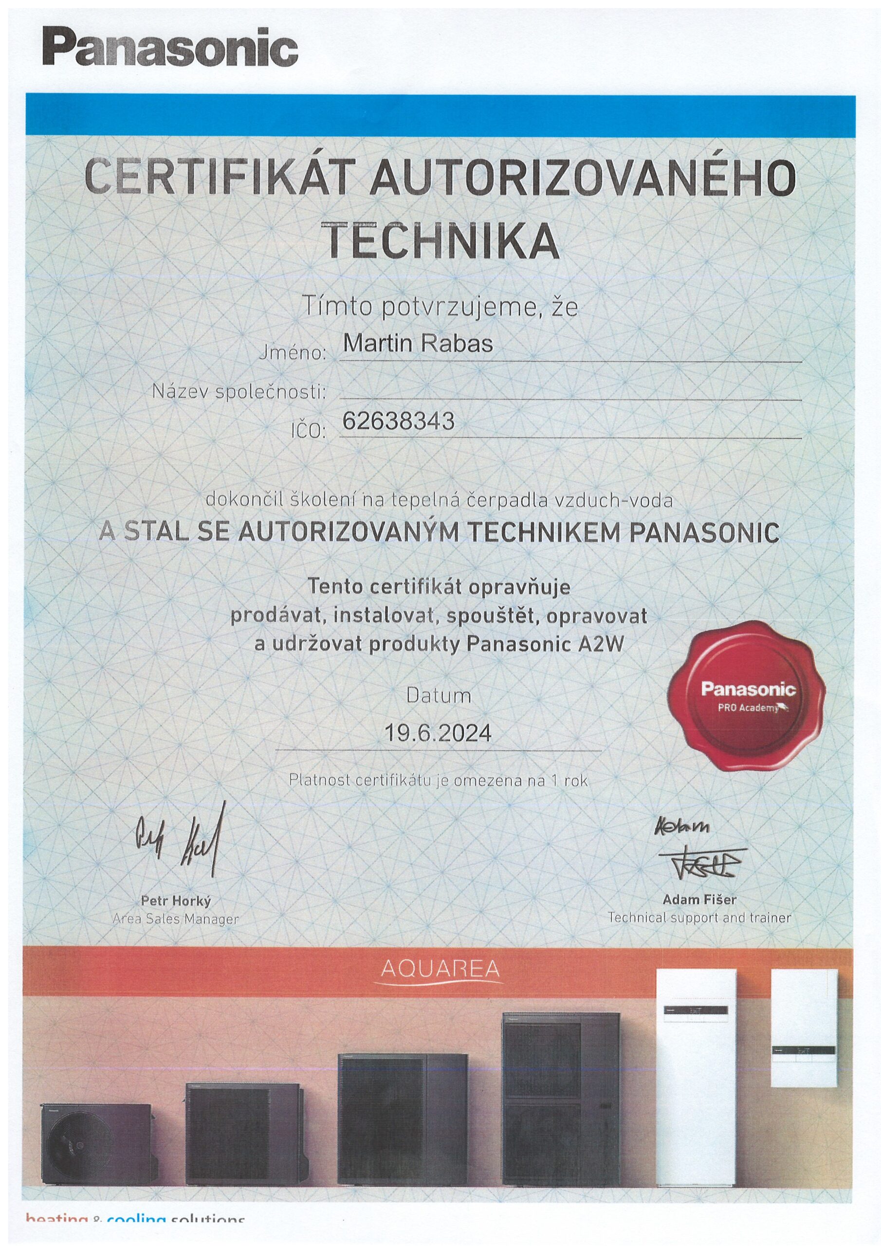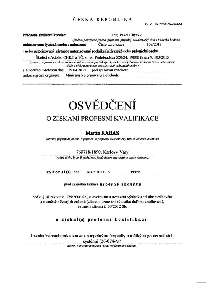 Dále jsme vlastníky osvědčení o profesní kvalifikaci v souladu se zákonem 406/2000 Sb., která jsou nutná instalaci tepelných čerpadel s využitím dotačních titulů, zejména pak NZÚ, NZÚ Light a Oprav dům po babičce